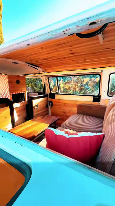 Bring unforgettable good vibes to your wedding or event with or restored & customized vintage VW Transporter thoughtfully converted into a modern photo booth space. Warm cedar wood paneling, clean coastal textures, and soft natural tones create a relaxed, California-surf atmosphere the moment you step inside. The lounge-style interior offers a comfortable place for guests to gather, take photos, and enjoy the experience at their own pace.